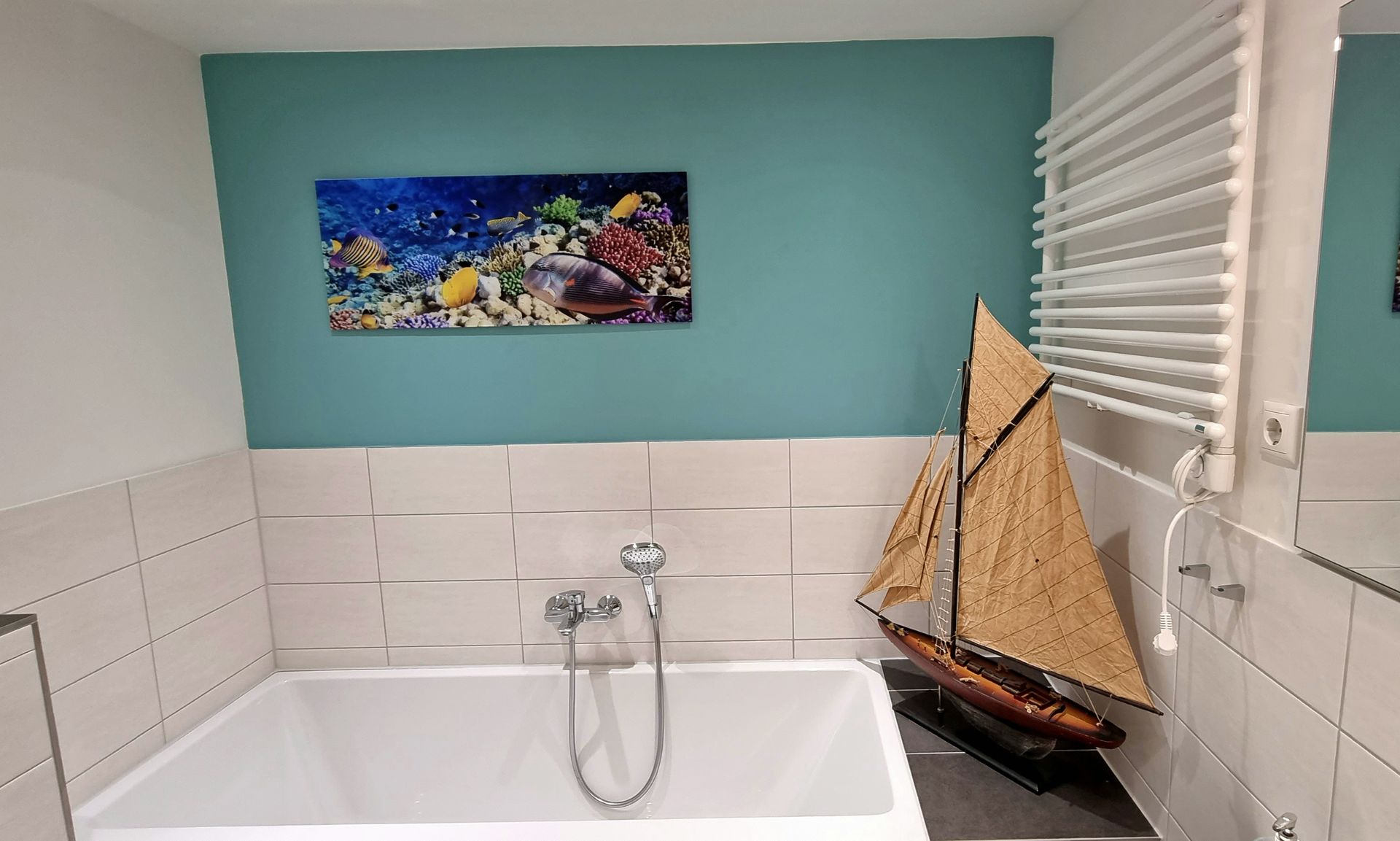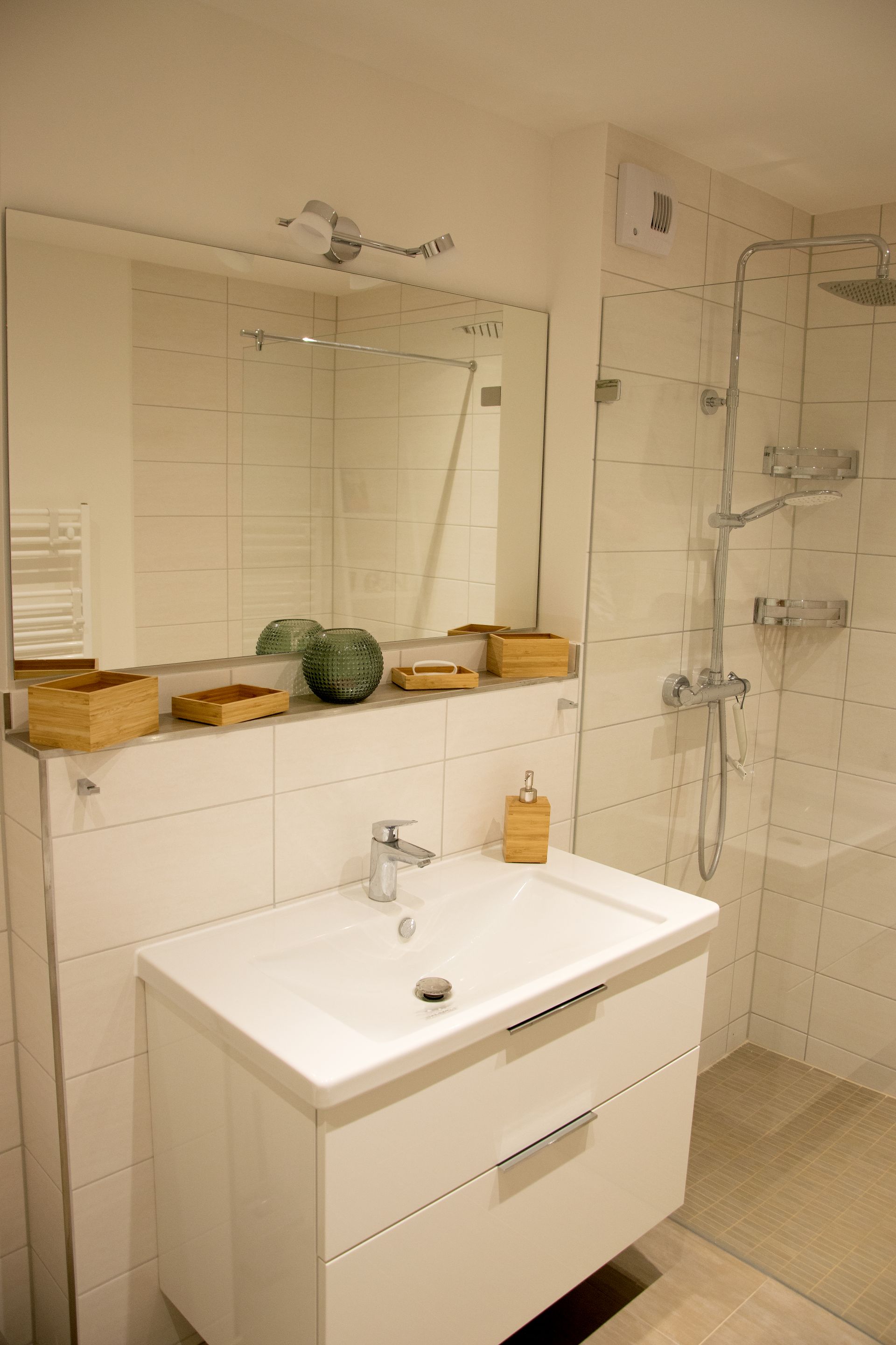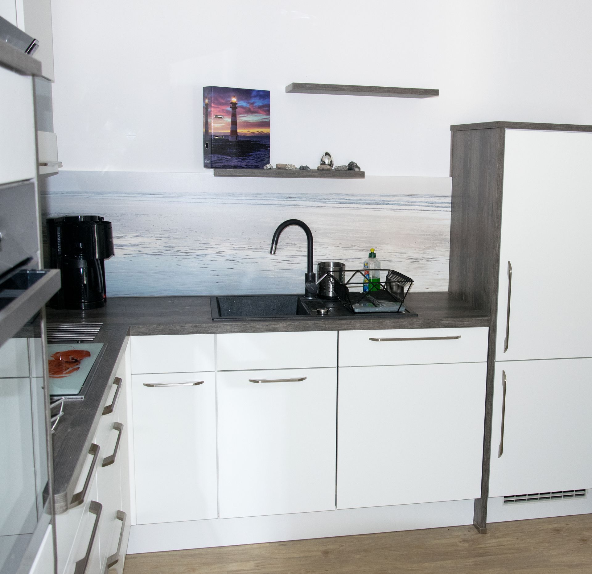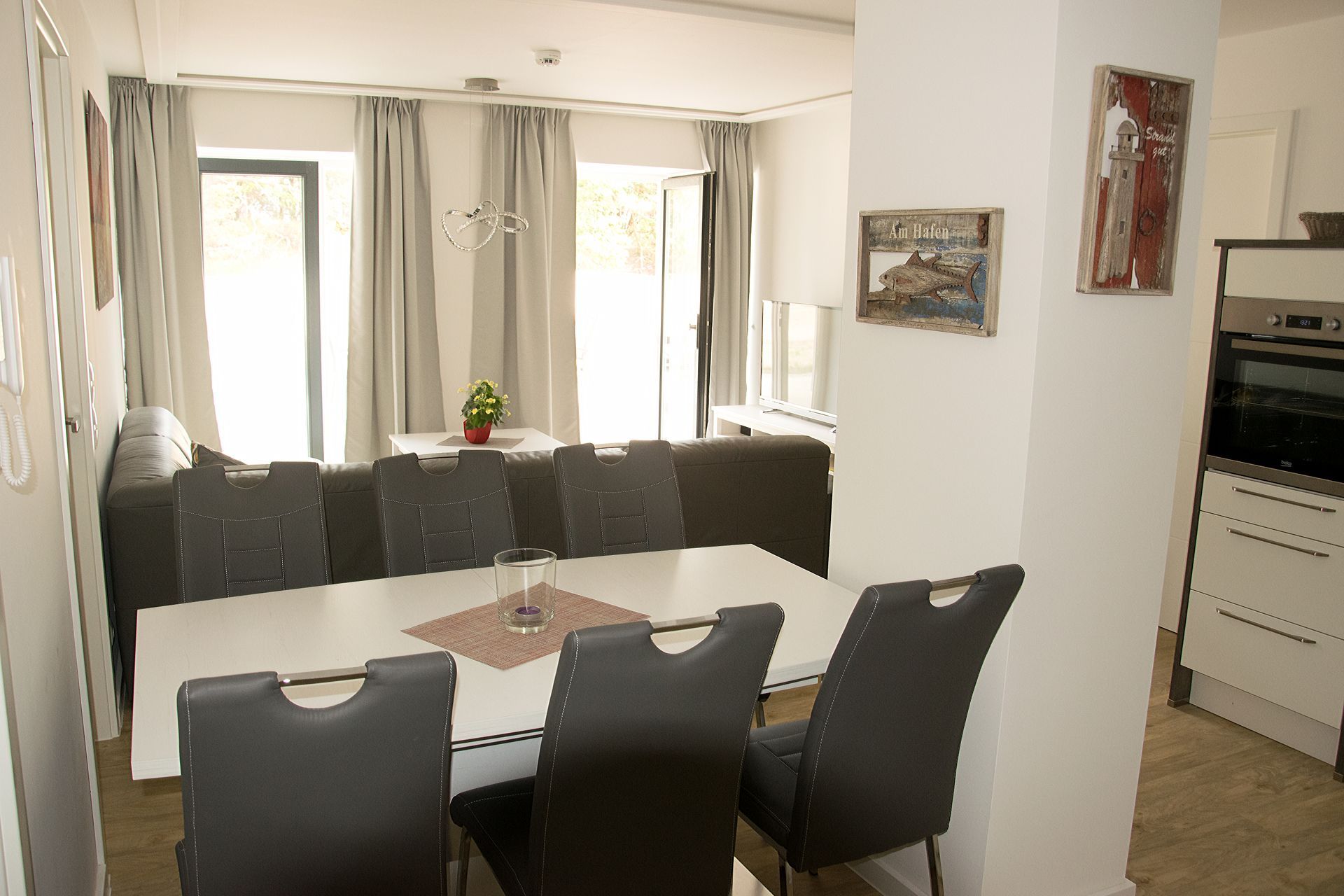 Sie finden auf 2 Terassen (see- und landseitig) immer ein ruhiges Plätzchen in der Sonne. In der modern eingerichteten Einbauküche können Sie, wenn Sie Lust dazu haben, nach Herzenslust kochen und backen. Auch da sind Sie, durch den offenen Küchen/Wohnbereich, nicht abseits, sondern immer mittendrin. Um für alle auch ein Rückzugsplätzchen zu finden, bieten 3 Schlafzimmer mit ausreichend Stauraum immer Platz. 2 Bäder und ein kleiner Flur komplettieren Ihre Ferienwohnung.